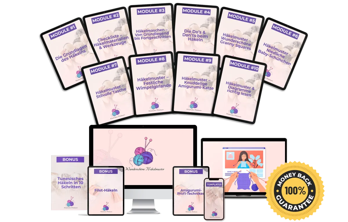 Ich habe alles Schritt für Schritt für dich aufbereitet, sodass du meine erprobten Muster, Methoden und Insider-Tipps direkt übernehmen kannst – und sofort anfangen kannst, wunderschöne Häkelstücke zu kreieren. Ganz ohne mühsames Ausprobieren und Fehler machen.
